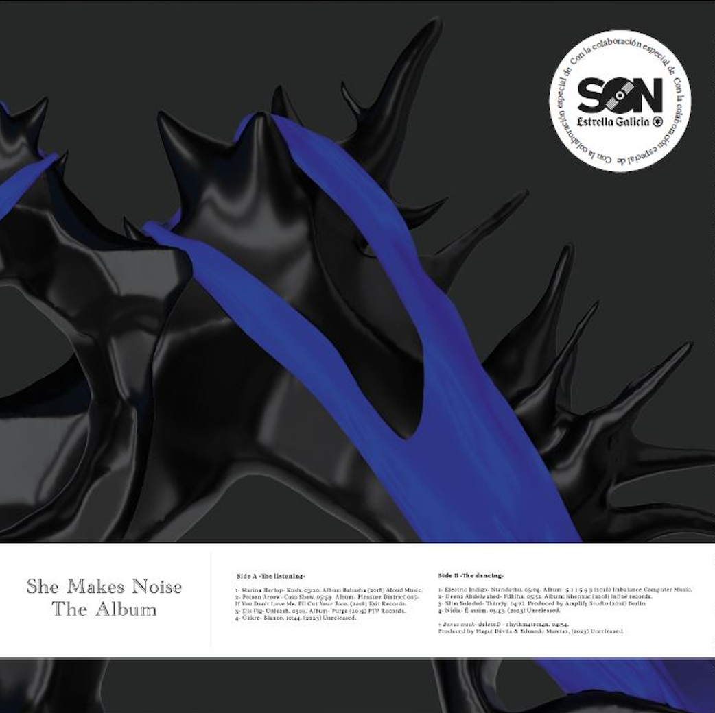 The vinyl works as an artistic object and brings together some of the artists and ideas that have had their place in She Makes Noise for eight editions. Two sides on the album and two different concepts for attentive listening and dancing. Side A of the album -The Listening- proposes four themes that include vocal experimentation, Latin sounds, noise, industrial and ambient. Connected to the local fabric, the work of the Spanish Marina Herlop and Uge Pañeda (aka Okkre) is included (with an unpublished song). From Colombia, Natalia Escobar (aka Poison Arrow) and Asian American songwriter and singer Felicia Chen (aka Dis Fig).